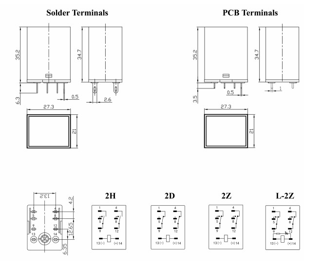Formularios de contacto: incluye configuraciones como 2Z (DPDT), 3Z (TPDT), 4Z (4PDT), 2H (DPST-No), 3H (TPST-No), 4H (4PST-No) y 2D (DPST-NC). Estos formularios atienden a diferentes requisitos de conmutación y son perfectos para diversos usos de relés en miniatura.